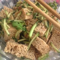 3. 黄瓜丝香菜還有蒜末加入烤麩中,倒入调好的麻酱,根據口味加入孜然粉,黑胡椒,然後拌匀,撒入適量芝麻即可享用~